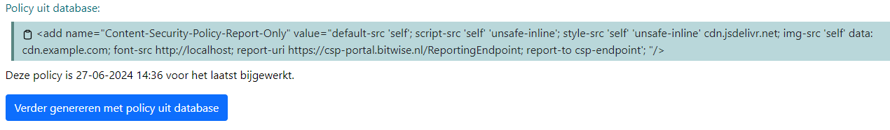 Vervolgens kan je jouw site weer opnieuw laten rapporteren, dan zie je de rapporten die je al toegestaan hebt, en jouw opgeslagen policy in de database. Onder de "Policy uit database" staat een knop waardoor je verder kan genereren met de policy die je al had: