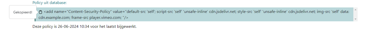 Als laatste kun je de policy echt toepassen door de nieuwe gegenereerde policy te kopiëren en in de config van de betreffende site plaatsen.