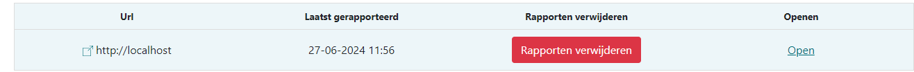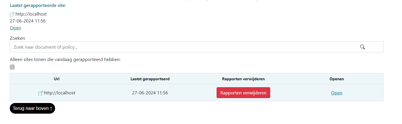 Zodra je de gewenste site hebt ingesteld en de applicate opstart, kun je een lijst zien met alle sites die als eindpunt deze applicate hebben bij het rapporteren. Hier kun je de huidige policy zien die gedetecteerd is en deze kan je bewerken door op "Openen" te klikken. Je kan bovenaan ook de website die meest recent gerapporteerd heeft zien.