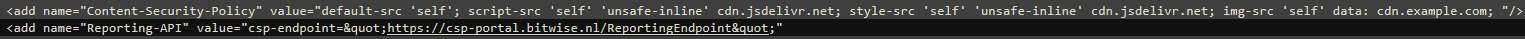 <add name="Reporting-Endpoints" value="csp-endpoint="https://csp-portal.bitwise.nl/ReportingEndpoint"" />
