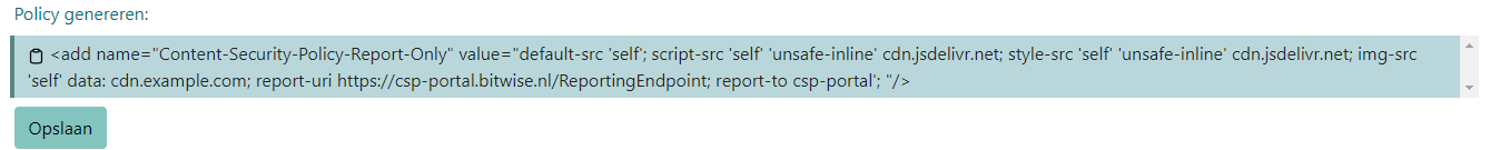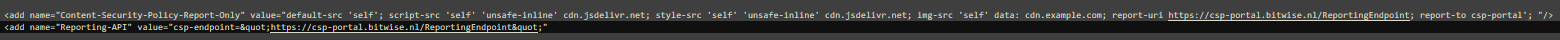 <add name="Content-Security-Policy-Report-Only" value="default-src 'self'; script-src 'self' 'unsafe-inline' 'unsafe-eval'; style-src 'self' 'unsafe-inline' 'unsafe-eval'; img-src 'self' data:; font-src (Url van de betreffende website); report-uri https://csp-portal.bitwise.nl/ReportingEndpoint; report-to csp-endpoint" />