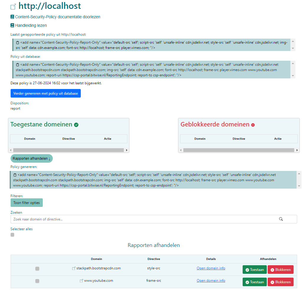 Wanneer je op "Openen" klikt, zie je een lijst met de domeinen die onze ingestelde CSP blokkeert. Wanneer je op "Toestaan" klikt bij een specifieke rij, verdwijnt die rij en wordt ze verplaatst naar een aparte lijst. De applicatie genereert een nieuwe policy afhankelijk van wat je toestaat. Als je op "Blokkeren" klikt, wordt ook die specifieke rij verplaatst naar een aparte lijst maar dan met alle geblokkeerde domeinen.